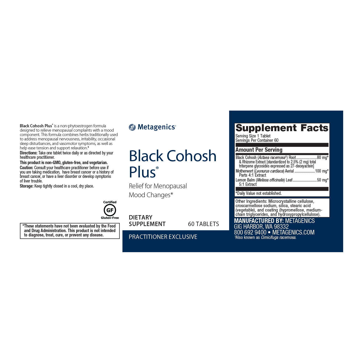 Black Cohosh Plus™ is a non-phytoestrogen formula designed to relieve menopausal complaints with a mood component. This formula combines herbs traditionally used to address menopausal nervousness, irritability, occasional sleep disturbances, and vasomotor symptoms, as well as help ease tension and support relaxation.