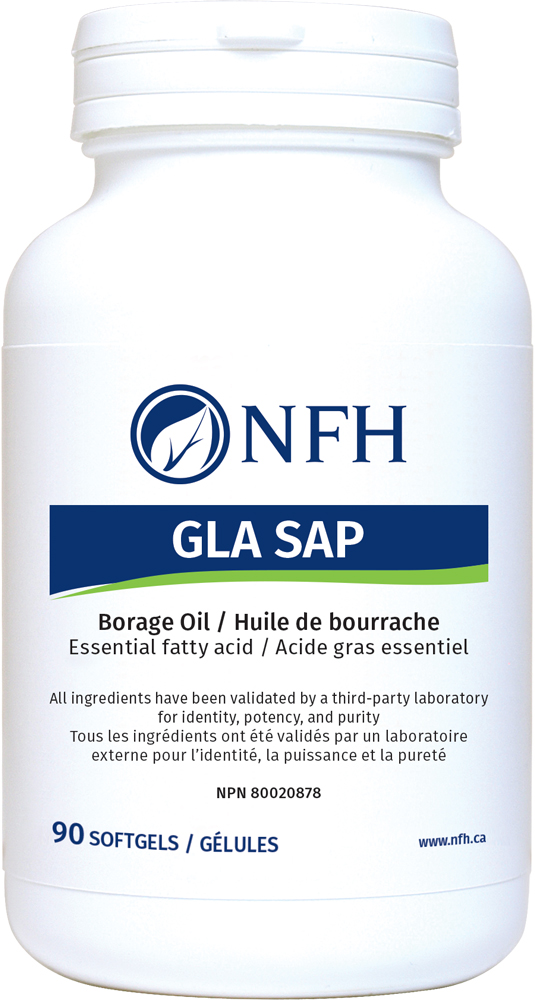 Borage oil contains the omega‑6 fatty acid gamma-linolenic acid (GLA) at a higher concentration than any other oil source. The essential fatty acids contained in borage oil, when absorbed by the body, are converted to prostaglandins. Prostaglandins are important for regulating many functions in the body including inflammation, the allergic response, as well as hormone and steroid production. The borage oil in GLA SAP is a naturally occurring organic source, is solvent-free, and is not bleached, deodorized, or refined.