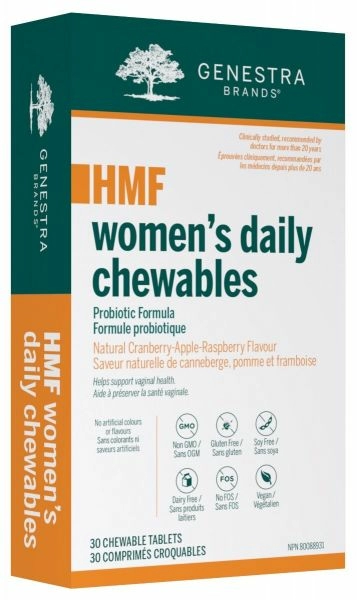 HMF Women’s Daily Chewables were specifically designed to support the unique needs of women. Each great-tasting chewable tablet offers 17.6 billion CFU from a combination of seven research-driven probiotic strains to help restore and maintain healthy vaginal flora. The vagina is a complex ecosystem that can by altered by many factors, including age, medication use, sexual activity, hygiene practices and hormone production.1 Lactobacilli are the dominant vaginal microorganisms in healthy women, helping to maintain normal vaginal microflora.1 They compete with other microorganisms for nutrients and adherence to the vaginal epithelium; decrease the vaginal pH by producing organic acids (primarily lactic acid); and produce antimicrobial compounds, including bacteriocins and hydrogen peroxide.1 In addition to providing two species of Bifidobacteria, HMF Women’s Daily Chewables offer three species of Lactobacilli, selected for their natural presence in the female flora.2-5 Included in this blend are L. rhamnosus HN001 and L. acidophilus La-14, which specifically support healthy vaginal flora.2-4 This probiotic combination also helps colonize both the large and small intestines to support gastrointestinal health. To further contribute to overall well-being, HMF Women’s Daily Chewables offer cranberry fruit extract, which helps prevent recurrent UTIs in women.