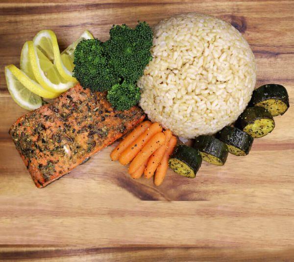 Our Regular size serves with 100 grams of cooked salmon and 150 grams of brown rice.