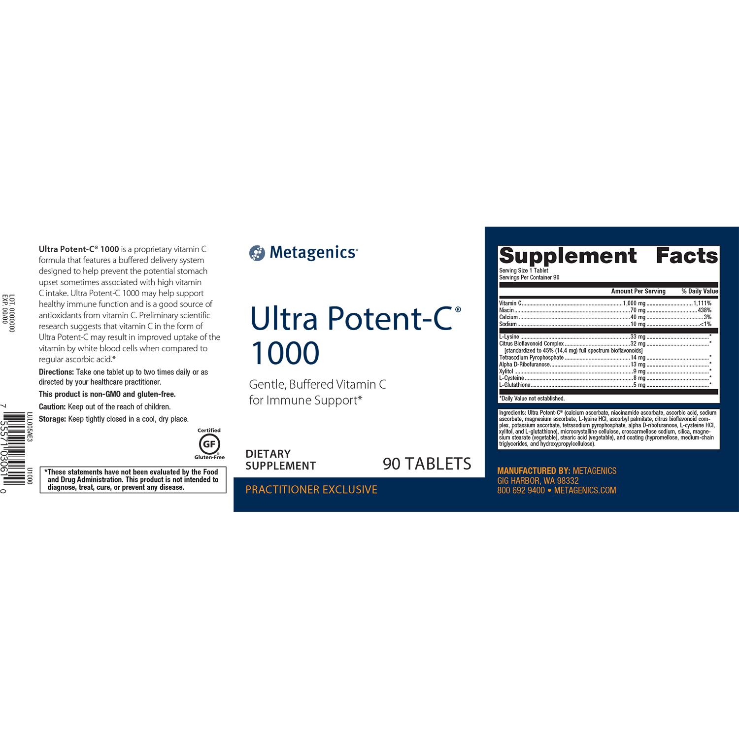 Ingredients: Ultra Potent-C® (calcium ascorbate, niacinamide ascorbate, ascorbic acid, sodium ascorbate, magnesium ascorbate, L-lysine HCl, ascorbyl palmitate, citrus bioflavonoid complex, potassium ascorbate, tetrasodium pyrophosphate, alpha D-ribofuranose, L-cysteine HCl, xylitol, and L-glutathione), microcrystalline cellulose, croscarmellose sodium, silica, magnesium stearate (vegetable), stearic acid (vegetable), and coating (hypromellose, medium-chain triglycerides, and hydroxypropylcellulose).