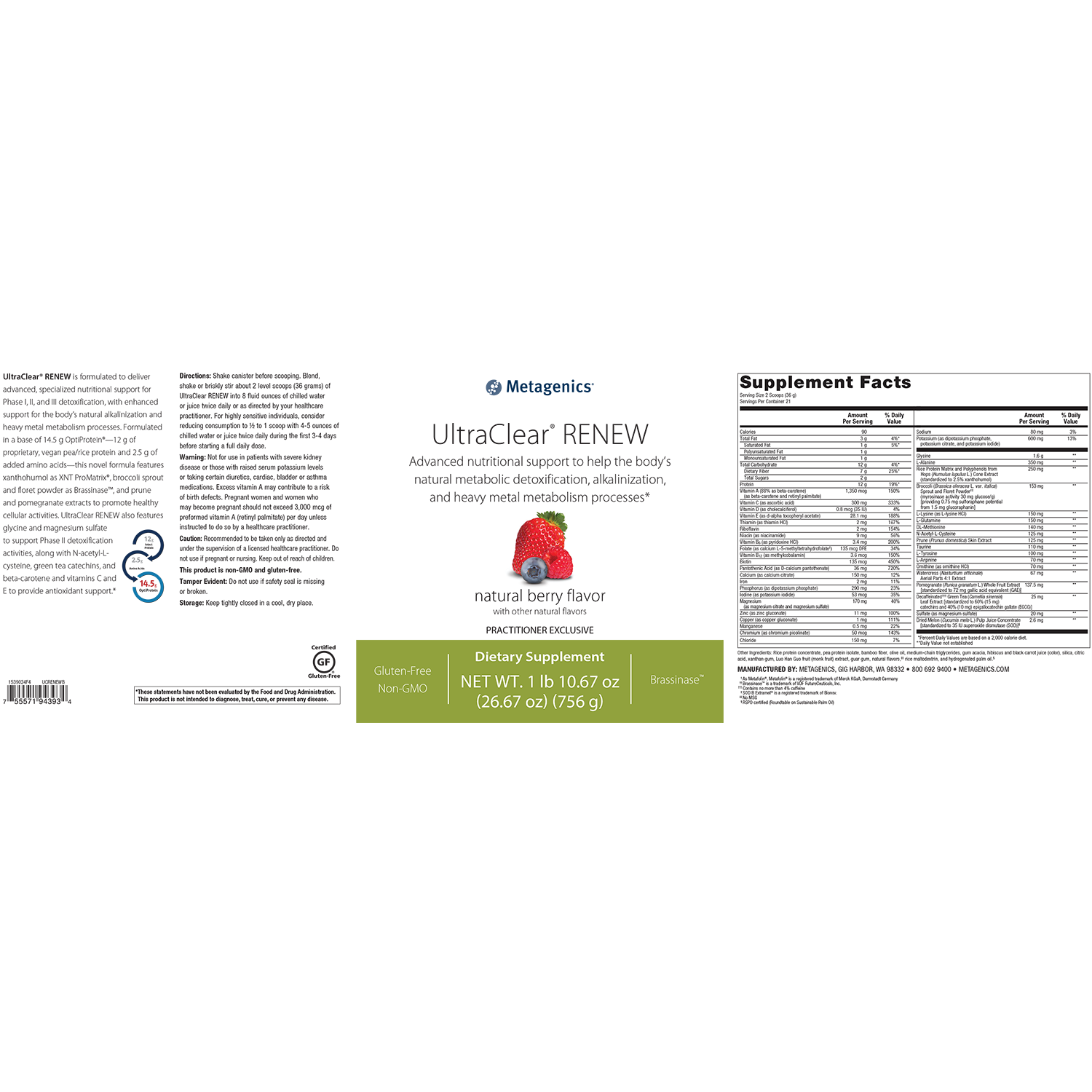 Directions: Shake canister before scooping. Blend, shake or briskly stir about 2 level scoops (36 grams) of UltraClear RENEW into 8 fluid ounces of chilled water or juice twice daily or as directed by your healthcare practitioner. For highly sensitive individuals, consider reducing consumption to 1/2 to 1 scoop with 4-5 ounces of chilled water or juice twice daily during the first 3-4 days before starting a full daily dose.