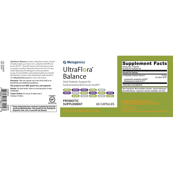 UltraFlora Balance provides a dairy-free base for a blend of highly viable, pure strains of L. acidophilus NCFM® and B. lactis Bi-07®—“friendly” bacteria that have been shown to support a healthy intestinal environment and immune health. Backed by the Metagenics ID Guarantee for purity, clinical reliability, and predicted safety via scientific identification of strains with established health benefits.*